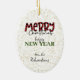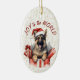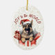 An der Vorderseite dieses Holiday-Ornaments ist ein Bild eines deutschen Schäferhundes, der eine rot-weiße Weihnachtsmannmütze trägt und aus einer Weihnachtsfeiertage herausguckt. Hinter dem Bild ist ein goldener Konfetti Sprinkle Hintergrund. Roter Text sagt "Joy to the World". Die Rückseite des Ornaments hat den gleichen Konfetti-Hintergrund und Textfelder, damit Sie jedes Ornament individuell gestalten können.