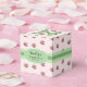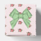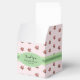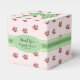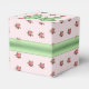 Hütte schick Gastgeschenk Hochzeit Box in einem schönen rosa und weiß Streifen Muster mit rosa Rosen, mit Grafiken von einem grünen Satin Look Bogen, auf der Oberseite, und Band, um die Mitte der Box. Eine grün-weiße, ovale Textplakette auf der Vorderseite hat einen schwarzen, benutzerdefinierten Text, der auf Sie zugeschnitten werden kann. Kleine Geschenkboxen für Bonbons und alles, was Sie gewollt haben, um Ihren Gästen zu geben.