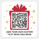 Business QR-Codesticker mit QR-Code auf einer roten (oder benutzerdefinierten) Geschenkboxen-Silhouette, umgeben von goldenen Farbradienten (gedrucktes Farbbild, nicht echte Folie) Sternen. Text, Schriftart und Farben können angepasst werden. Ideal, um Ihren Kunden zu einem Geschenk oder Freebie zu führen.