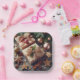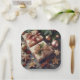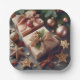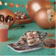 Die Geschenke sind hellbraun eingewickelt und mit goldenen Bögen dekoriert. In der Nähe der Geschenke gibt es eine Vielzahl von Weihnachtsdekorationen, darunter Bausteine, goldene Sterne, grüne Kiefernäste mit Kiefernzapfen und Zimtsticks. Andere Gewürze wie Sternanis sind in der Dekoration vorhanden. Der Hintergrund des Bildes ist dunkel, was die warme und luxuriöse Atmosphäre der festlichen Weihnachtsszene verstärkt.