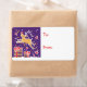 Niedliche illustrierte Weihnachtsgeschenketiketten mit einer Illustration eines Rentiers über Geschenke an einer schneebedeckten Weihnachtsnachtsnacht. Passen Sie sich mit Ihren eigenen Namen an. Illustration und Design von Sarah Trett.