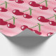 Rote Kirschen mit grünen Stielen auf einem weichen rosa Hintergrund bilden ein sich wiederholendes Stoffmuster. Die Kirschen sind gleichmäßig geformt und schattiert, was ein glänzendes Aussehen verleiht. Die grünen Stiele kontrastieren mit dem kräftigen Rot der Kirschen und sorgen für einen frisch und lebendigen Look. Das Design ist einfach, aber auffallend, oft in Textilien für eine spielerische und fröhliche Ästhetik verwendet.