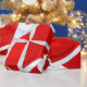 Niedliche Weihnachtsverpackung mit Illustrationen von Weihnachtsgeschenken, Ziergegenständen, Sternen und Handschuhen in Gelb, Rot, Blau und Rosa. Schönes festliches Verpackungspapier für Ihre Weihnachtsgeschenke.