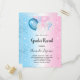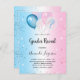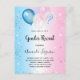 Für ein Geschlecht zeigen Sie Babydusche, Ein blaues und rosa Farbverlauf Hintergrund. Glitzer und Blau, rosa und weiße Ballons. Personalisieren und fügen Sie den Namen der Mutter zu sein und Party-Details. Der Name und der Text: Gender Reveal werden mit einem handgeschriebenen Stilskript geschrieben. Zurück: Hintergrund mit blauem und weißem Farbverlauf, Glitzer- und Postkartendesign. Tipp: Wenn Sie es nicht so gewollt haben, dass es wie eine Postkarte aussieht, klicken Sie auf Anpassen, gehen Sie auf die Rückseite und entfernen Sie den Trenner und posten Sie die Briefmarke.