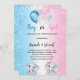 Für ein Geschlecht zeigen Babydusche. Ein blauer, weißer und rosa Farbverlauf. Glitzer und Blau, rosa und weiße Ballons und Staub aus Glitzer. Ein Babyelefant und ein gabeliger Elefant. Personalisieren und fügen Sie die Namen der Eltern zu sein und Party-Details. Der Name und der Text: Junge oder Mädchen werden mit einem handgeschriebenen Stift geschrieben