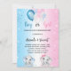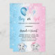 Für ein Geschlecht zeigen Babydusche. Ein blauer, weißer und rosa Farbverlauf. Glitzer und Blau, rosa und weiße Ballons und Staub aus Glitzer. Ein Babyelefant und ein gabeliger Elefant. Personalisieren und fügen Sie die Namen der Eltern zu sein und Party-Details. Der Name und der Text: Junge oder Mädchen werden mit einem handgeschriebenen Stift geschrieben
