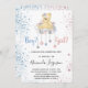 Für ein Geschlecht zeigen Babydusche. Ein schick weißer Hintergrund. Mit Glitzer-Staub dekoriert, blau und rosa gedämpft. Ein Teddybär mit weißen, blauen und rosa Ballons. Personalisieren und fügen Sie den Namen der Mutter zu sein und Party-Details. Der Name und der Text: Junge? Mädchen? werden mit handgeschriebenem Stilskript geschrieben