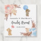 Ein weißer Hintergrund. Die Einrichtung besteht aus Rose, Rosa und Blau, Pampas-Gras. Ein Teddy, der einen blauen Ballon hält, und ein Teddy, das einen rosa Ballon hält. Personalisieren Sie die Namen der Eltern und das Party. Zurück: kein Text, sodass Sie per Hand schreiben können.