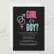 Dieses Design enthält die Worte "Mädchen oder Junge"? in Rosa und Blau neben den Symbolen für Junge und Mädchen, auch in Rosa und Blau. Die Details zum Party liegen unten in Weiß.