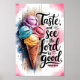 Eine Aquarellillustrierung einer Eistüte mit mehreren Bruchstücken Eis und Sprinklen. Die Eistüte wird auf einem Holzbrett platziert. Es gibt den Text "Geschmack und sehen, dass der Herr gut ist.", der im kalligraphischen Stil geschrieben ist. Der Hintergrund ist ein weiches Rosa.