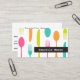 Retro Koch- oder Catering-Visitenkarten mit bunten Besteck auf weißem Hintergrund. Rosa, türkisfarben, orange und gelb-grün.