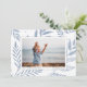 Elegante und schlichte Urlaubsfotokarte umrahmt ein Single horizontal oder landschaftlich orientiertes Foto mit weißem Rahmen, auf einem Hintergrund von subtilen staubblauen botanischen Blätter und Blattwerk. Personalisieren Sie mit Ihrem individuellen Urlaubssegment (mit "Frohe Weihnachten" gezeigt), Ihrem Familiennamen und dem Jahr.