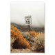 Die Kunst verfügt über ein schwarz-weißes Geschwindigkeitsschild, das in einer wunderschönen, goldblühenden Sagebrush-Pflanze am Fuße eines nebeligen Berges gepflanzt ist. Original Kunst von Featherfall Studio.
