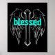 Ein inspirierendes und spirituelles Design mit dem Wort "gesegnet" in leuchtend türkisfarbenen Blockbuchstaben auf der Linie zeichnend eines Kreuzes mit Engelsflügeln.