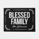 Gesegnete Familien-Fußmatte, Wörter, "SEGNETE FAMILIE" mit kundenspezifischem Bereich für Familiennamen im Weiß mit elegantem weißem dekorativem Rahmen. Hintergrund ist, schwarz auf diesem Entwurf aber kann zu jeder möglicher Farbe besonders angefertigt werden.