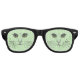 Diese Retro-Party-Brille hat das Gesicht einer Katze in Schwarz gezeichnet mit großen grünen Augen und langen Whiskers auf einem hellgrünen Hintergrund.