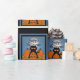 Niedliches glückliches Halloween-Verpackungs-Papier mit einem gespenstischen Kitty mit glühenden roten Augen und Kürbisen. Er liest glückliches Halloween.