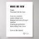 Make Me New Liebe Ermutigung Gedicht Poster Wanddekor Schwarz-Weiß-Poster. Bei MotherEagle Inspiriere, vermischen wir den Soul-mitreißenden Power der Poesie mit wunderschön gefertigten Alltagsgegenständen, um Geschenke zu schaffen, die Ihren Raum inspiriert, behaglich und erheben. Jedes Produkt - von Tasse und Bekleidung bis hin zu Zuhause-Dekor und Schreibwaren - enthält originelle Gedichte, die mit Ihrem Herzen in Einklang stehen und Freude am Alltag wecken. Ob Sie ein bedeutendes Geschenk für einen geliebten Menschen oder eine persönliche Erinnerung der Schönheit des Lebens suchen, unsere Kollektion verwandelt Wörter in greifbare Schätze. VERÄNDERN SIE IHREN PLATZ UND SPIRIT MIT POETISCHEN GIFTS APPAREL & ACCESSORIES: Tragen Sie Ihre Inspiration Unser Bekleidungsstück zum Thema Poesie lasse Ihnen Inspiration zu tragen, wohin Sie auch gehen. Von der Stärkung von T - Shirt mit Versen wie "Rise and Shine" bis hin zu gemütlichen Schals ist jedes Stück ein Gesprächsstarter. WOHNGESTALTUNG: Mit der Bedeutung Ihren Raum in ein Heiligtum verwandeln Sie Ihre Zuhause in ein Heiligtum mit unserer Poesie-Wandkunst, werfen Kissen und Küchengeschirr. Stellen Sie sich vor, Sie schlürfen einen Morgenkaffee aus einer Tasse, die mit "Holding Space for Liebe" beschriftet ist, oder schmücken Ihr Wohnzimmer mit einer Leinwand, die "We Belong Together" flüstert. STATIONERY, JOURNALS, NOTEBOOKS & PLANNERS: Schreiben Sie Ihre eigene Geschichte Unsere Poesie-Journale und Grußkarten sind perfekt für Schriftsteller, Träumer und Geschenkgeber. NEHMEN SIE DIE NÄCHSTEN SCHRITTE: JETZT EINTRITT: Entdecken Sie unsere kuratierten Sammlungen und finden Sie das perfekte Stück, um Ihren Tag inspirieren. Klicken Sie auf "Zum Warenkorb hinzufügen" und ließ Poesie verwandeln Ihre Welt. VERBREITEN SIE DIE LIEBE: Verlass einen ⭐ ⭐ ⭐ ⭐ Nachbearbeitung - Ihre Worte helfen anderen, unsere Kunst zu entdecken. BLEIBE VERBINDET: Folgen Sie uns auf Instagram und Pinterest (@motherEagle_Inspiriere) für neue Gedicht-Releases und hinter den Kulissen flüchtige Blick in unseren kreativen Prozess. DIVE DEEPER: Liebe unsere Arbeit? Entdecken Sie unsere Poesie auf https://books2read.com/keroyking, wo Verse in vollen Sammlungen zum Leben erweckt werden, für Titel wie "Göttliches Soul flüstert", "Flying without Wings" und "Dancing with words". Vielen Dank für Ihren Besuch MotherEagle Inspiriere! Ihre Unterstützung erlaubt uns, die Gedichte behalten, die heilen, stärken und miteinander verbinden. Jeder Kauf ist nicht nur eine Transaktion, sondern ein Schritt in Richtung Gebäude einer authentischen Gemeinschaft. Besuchen Sie www.zazzle.com/store/mothereagle_inspires für Geschenke zum Thema Gedichte und https://books2read.com/keroyking für Poesie Bücher und mehr... #Inspirationalpoetrygifts #Handcraftedliterarydécor #Uniquemotivationalappare #Personalisiert poetischer Briefer #Meaningfulgiftideas for #booklovers Suchen Sie nach "poetry-themed Zuhause décor" oder "gifts for poetry enthusiasten"? Sie haben Ihr Ziel gefunden