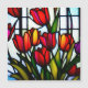 In einem Leuchtturm sind rote Tulpen abgebildet