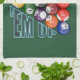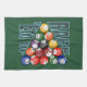 Beanspruchen Sie EM oben für Poolspieler und Poolhaifische stark. Stark beanspruchte Billardkugeln mit einem grünen Billardtischhintergrund.