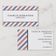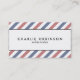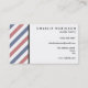 Ein einfacher und moderner Entwurf für einen Friseur oder einen Friseur, die ein Muster der gedämpften roten und blauen Streifen auf einem weißen Hintergrund kennzeichnen. Es gibt einen weißen Kasten mit einer schwarzen Grenze in der Mitte, damit Sie mit Ihrem Namen und Beruf besonders anfertigen.