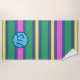 Brillante rosa, grüne, gelbe und blaue Streifen füllen dieses farbenfrohe Badetuch. Ein dunkelblaues Monogramm wird gegen einen hellblauen Kreis Set.