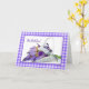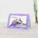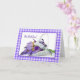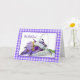 Iris-Bouquet in einem weißen Korbkorb mit lila Gingham-Hintergrund, um bald wieder gesund zu werden.