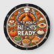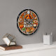 This round wall clock features a humorous and appetizing Thanksgiving theme, centered around a cartoon turkey chef with a knife and fork. Surrounding the turkey are various classic Thanksgiving dishes like pumpkin pie, green beans, cranberry sauce, and a pumpkin, all against a background of autumn leaves. The playful text "GET YOUR FAT PANTS READY" is prominently displayed, making it a fun addition to holiday decor.