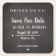 Einfache rustikale lässige Drinks auf uns! weiße Typografie-Skript, Name, Datum und Ort personalisierte Hochzeit speichern das Datum Untersetzer auf einem dunkelgrauen Chalkboard Hintergrund.