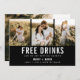 Eine lustige Hochzeit bewahrt die Dattelkarten in einem modernen 3-Foto-Schwarz-Design, das "Free Drinks und wir heiraten" lautet. Passen Sie die Vorderseite der Karte mit 3 Ihrer Verlobung Fotos und Hochzeitsdetails an. Sie können auch ein vertikales Foto auf der Rückseite hinzufügen.