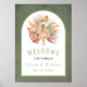 Tropisch getrocknete Palmen Blätter, Pampas Gras und Protea-Blume zeigen grüne Botanische Begrüßungspakete. Dieses schöne Hochzeitsdesign besticht durch einen Bogenrahmen auf grünem, farbigem Hintergrund. Im Rahmen befindet sich Ihr Text, ein Strauß mit Blätter aus getrockneten Palmen, Protea-Blume und Pampas-Gras.