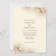 Diese Hochzeitseinladung mit Grafiken von getrockneten Palmen und rot-farbenen Blume auf einem hellcremefarbenen Hintergrund. Die Rückseite der Einladung ist eine solide Weise grün Farbe.