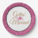 Papierplatte aus Party in einem hübschen Glitzer aus rosa Imitaten rund um den Rand und die Weiße Mitte. Gettin' Verheiratet in einem extravaganten Drehbuch in der Mitte mit zwei rosa Herzen. In 9" Größe angezeigt. Verkauft in Paket mit acht. Passen Sie dieses Objekt an oder kaufen Sie, wie es ist.