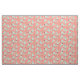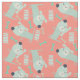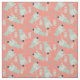 Der bunte, skurrile Stoff, der für Hundeliebhaber jeden Alters gut geeignet ist, enthält blaue Hunde, Knochen aus Ton und Aqua und Text, der auf Korallenhintergrund Woof liest.