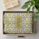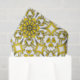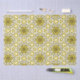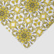 Intricate arabesque Muster mit symmetrischen Blumenmotiven in schwarz, weiß und gelb. Jedes Motiv besteht aus einer zentralen Blume, die von blattähnlichen Formen umgeben ist und eine kreisförmige Anordnung bildet. Herzförmige Elemente füllen die Räume zwischen Motiven. Das Design ist auf einem weißen Hintergrund gehalten und bildet einen auffallenden Kontrast zu den detaillierten Linien. Dieser Stil erinnert an die traditionelle Nahost-Zierkunst und betont Symmetrie und Wiederholung.
