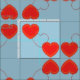 Grafisches Bild eines "Draht-Herzens" flankiert von zwei "festen" Herzen auf einem 45-Grad-Winkel. Dieses Motiv, wenn es in der "spiegelnden" Kachel repliziert, bildet Quadrate in den Herzen umrissen. Der hellblaue Hintergrund kann angepasst werden.