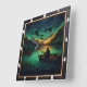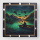 Diese detaillierte Abbildung zeigt einen Mann in einem Boot auf einem See mit einem unverkennbaren dunklen, bemalten Lederhintergrund. Die Szene ist voller stilisierter Elemente wie Bäume, Berge und Fische. Ein lebendiger Sonnenuntergang mit Neonfarben erhellt den Himmel und schafft einen schönen Kontrast zum dunkleren Vordergrund.