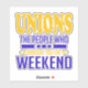 Aufkleber, auf dem stolz die Meldung "Gewerkschaften: Die Leute, die dir das Wochenende gebracht haben" angezeigt wird. Diese eindrucksvolle Aussage ist ein Nicken an die fleißigen Männer und Frauen, die unermüdlich für die Rechte der Arbeitnehmer und faire Arbeitspraktiken gekämpft haben.