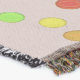 Punkte in Primärfarben (orange, rot, lila, blau, grün, gelb), sind in einem Halbkreis angeordnet und in diagonalen Reihen auf einem lila-beigen Hintergrund repliziert.