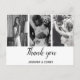 Eine schöne Art, "Danke" zu sagen, an alle Leute, die Ihren Hochzeitstag besonders gemacht haben. Auf einem minimalistisch-weißen Hintergrund können Sie Ihre Lieblings-Hochzeit-Fotos individuell gestalten. Mit dem Text "Danke," in fett schwarz. Platz zum Hinzufügen von Namen und/oder Hochzeitdatum. Das Gegenteil ist leer, damit Sie Ihre eigene Wertschätzung und Liebe schreiben können.