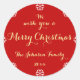 Elegantes, individuelles, personalisiertes Weihnachtsrot, wunderschöne Imitate Goldschrift / Typografie "Wir wünschen Ihnen ein frohes Weihnachtsfest", Schneeflocken, klassisches Rundaufkleber. Um Ihre Wünsche anzupassen, geben Sie einfach Ihren Namen / Paare Namen / Familienname / Nachname, und das Jahr ein. Ein schöner Aufkleber, der perfekt für Ihre Weihnachtsbriefe in dieser Urlaubssaison ist.