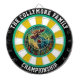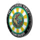Eine kreisförmige Darstellung eines Elchs mit Geweih, umgeben von Bäumen und einer Zielscheibe