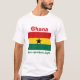 Ein editable Titel und ein Slogan begleitet den zentrierten schwarzen Stern über den roten, gelben und grünen Bändern der ghanaischen Flagge auf der Front dieses T - Shirt. Die Rückseite zeigt eine ausführliche Karte von Ghana an.