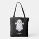 Desteis Cartoon-Darstellung eines niedlichen Geistercharakters mit einem überraschten oder besorgten Gesichtsausdruck. Die Hintergrundfarbe ist schwarz und es gibt auch einen personalisierbaren Textbereich für einen Namen oder einen anderen benutzerdefinierten Text. Dieses Design ist ideal für Halloween Zeit.
