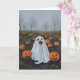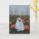 Diese Grußkarte zeigt ein Aquarellportrait eines Hundes, der als Geist verkleidet ist, der in einem unheimlichen Kürbispflaster stehend ist.