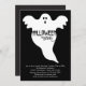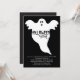 Moderne und minimalistische Halloween Einladung. Auf einem schwarzen Hintergrund befindet sich ein großer weißer Geist mit den Worten "Halloween-Party". Die Details des Party werden unten auf der Karte angezeigt. Stilvolles und dennoch lustiges Design, das für eine lustige und unvergessliche Veranstaltung ideal ist. Fügen Sie Ihre eigene Formulierung hinzu.