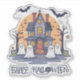 Dies ist ein niedlicher Halloween-Aufkleber mit niedlichen Geistern, die vor einem Spuk Herrenhaus stehend sind. Sie können den Standardtext "HAPPY HALLOWEEN" anpassen.
