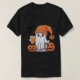 T - Shirt mit einem niedlichen Gespenst in einer orangefarbenen Mütze hält ein Glas Orangensaft und stehend neben zwei lächelnden Jack-o'-Laternen. Fledermäuse und winzige Herzen schweben im Hintergrund und schaffen ein spielerisches Halloween-Ambiente.