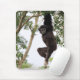 Gibbon sieht direkt auf die Kamera, während sie aus einem Baumzweig schwingt.
