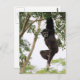 Gibbon sieht direkt auf die Kamera, während sie aus einem Baumzweig schwingt.